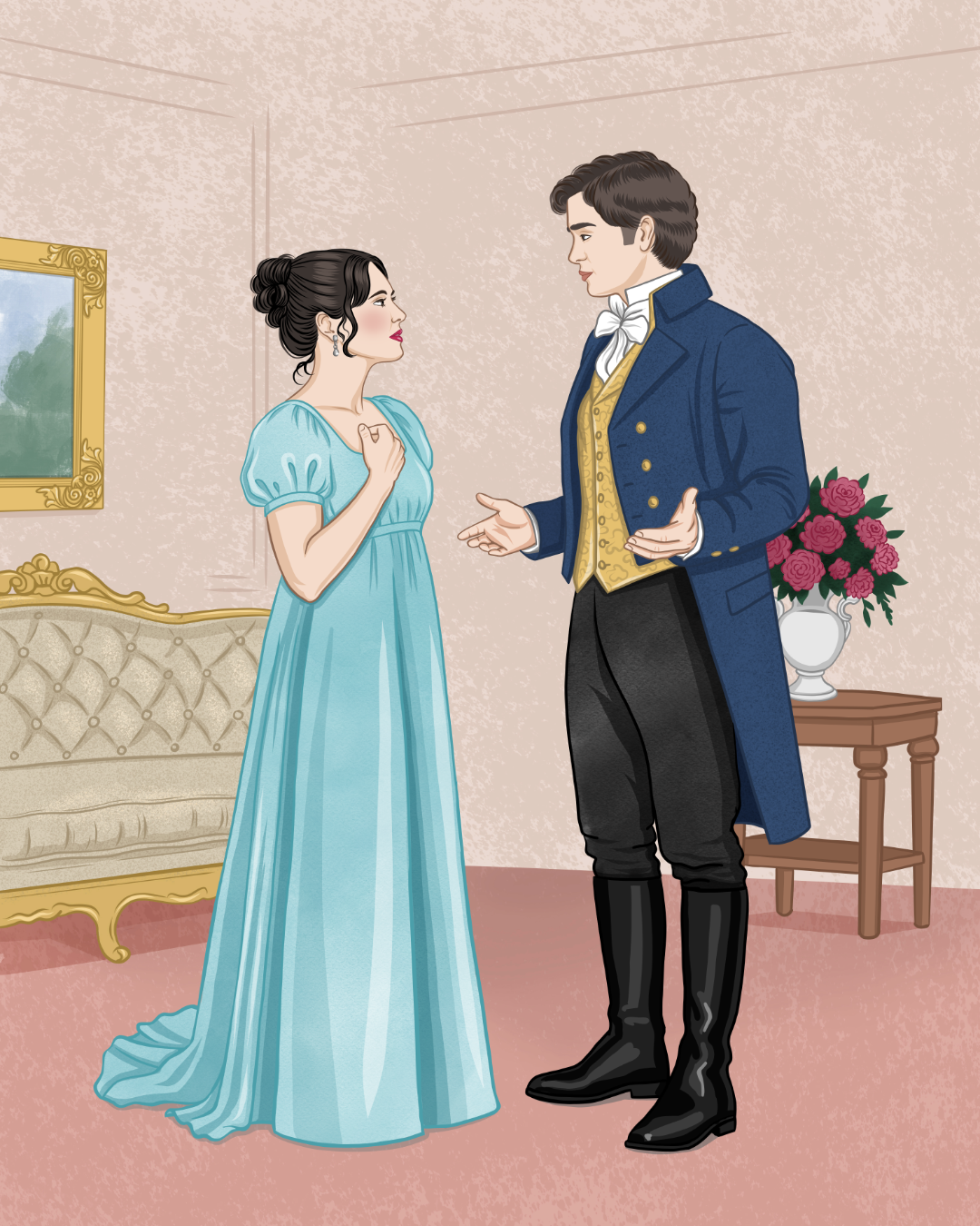 Na ilustracji chciałam uchwycić motywy filmowe, klimat ery regencji i napięcie, które było odczuwalne pomiędzy bohaterami.