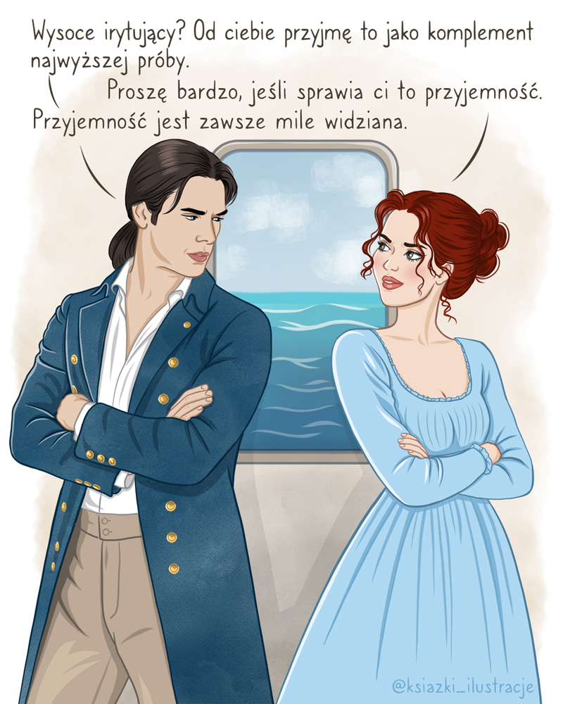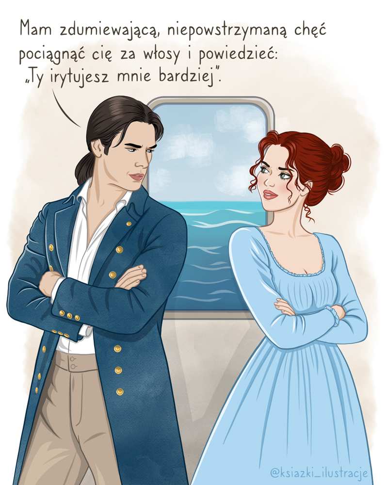 „Inna panna Bridgerton” Julii Quinn oprócz tego kostiumowego klimatu serwuje jeszcze statki, piratów i… porwanie. Najbardziej spodobały mi się początkowe słowne przepychanki między Poppy Bridgerton a Andrew – kapitanem statku, którym dziewczyna wbrew swojej woli płynie do Portugalii. To właśnie te dialogi stały się inspiracją do mojego fan artu. Postanowiłam uchwycić energię bohaterów i dodać do ilustracji kilka cytatów, które najlepiej oddają ich relację – pełną napięcia, ironii i tej charakterystycznej iskry.