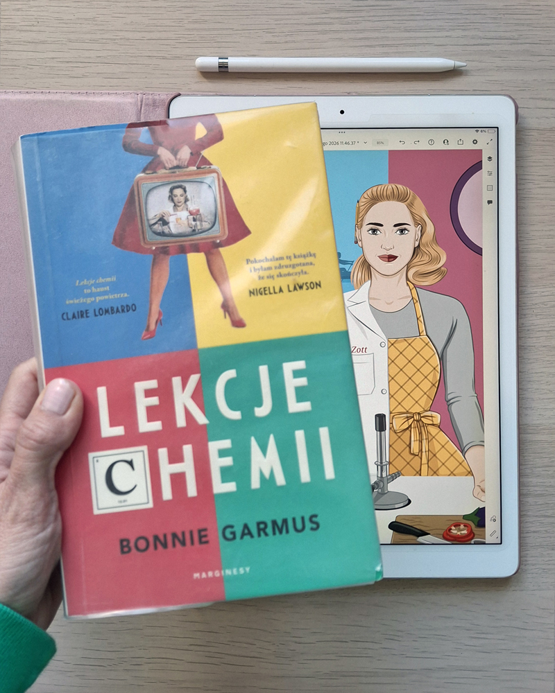 Na ilustracji postanowiłam podkreślić dwie drogi kariery zawodowej głównej bohaterki – Elizabeth Zott. Z jednej strony świat nauki i laboratorium, z drugiej – telewizyjna kuchnia, która stała się dla niej zupełnie nową przestrzenią działania. Podziwiam ją za to, jak potrafiła odnaleźć się w każdych warunkach i w każdym miejscu, do tego wierną swoim wartościom, przekonaniom i ambicjom.