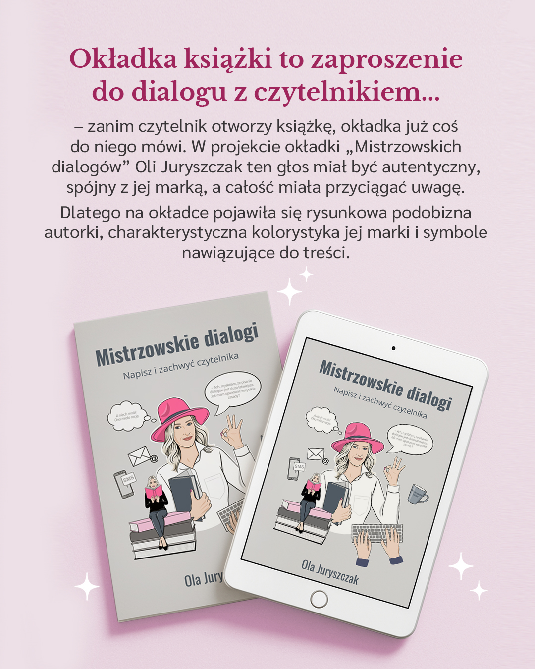 Zanim czytelnik otworzy książkę, okładka już coś do niego mówi. W projekcie okładki „Mistrzowskich dialogów” Oli Juryszczak ten głos miał być autentyczny, spójny z jej marką, a całość miała przyciągać uwagę. Dlatego na okładce pojawiła się rysunkowa podobizna autorki, charakterystyczna kolorystyka jej marki i symbole nawiązujące do treści.