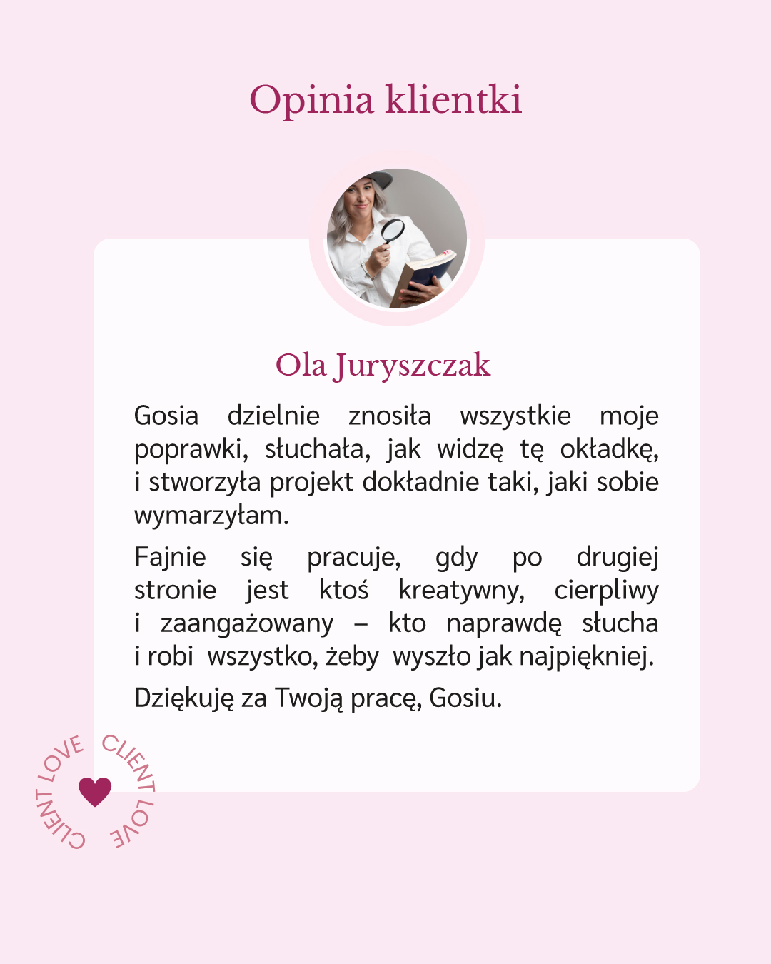 Opinia Oli o mojej pracy: “Gosia dzielnie znosiła wszystkie moje poprawki, słuchała, jak widzę tę okładkę, i stworzyła projekt dokładnie taki, jaki sobie wymarzyłam. Fajnie się pracuje, gdy po drugiej stronie jest ktoś kreatywny, cierpliwy i zaangażowany – kto naprawdę słucha i robi wszystko, żeby wyszło jak najpiękniej. Dziękuję za Twoją pracę, Gosiu.”